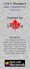 Accident Reports I was on my way to the doctor with rear end trouble when my universal joint gave way causing me to have an accident. Ad Typos We build bodies that last a lifetime.The Bible According to Kids David was a Hebrew king skilled at playing the liar.Church Bulletins Due to the Rector's illness, Wednesday's healing services will be discontinued until further notice.Courtroom Bloopers Q: The truth of the matter is that you were not an unbiased, objective witness, isn't it? You too were shot in the fracas? A: No, sir. I was shot midway between the fracas and the navel.English Misuse in Signs In an advertisement by a Hong Kong dentist: "Teeth extracted by the latest Methodists."Family Feud Q: Name something that flies that doesn't have an engine. A: A bicycle with wings.Foreign Brands Superglans (car wax, Netherlands)Instruction Labels On a bar of Dial soap: "Directions: Use like regular soap."Newspaper Headlines Half of U.S. High Schools Require Some Study for GraduationOn the Beat "God must love stupid people, 'cause he sure made a lot of them."School Excuse Notes Please excuse Gloria from Jim today. She is administrating.Things Kids Say (Regarding when is it okay to kiss someone?) "When they're rich." - Pam, age 7Welfare Requests Unless I get my husband's money pretty soon, I will be forced to lead an immortal life.What the Doctors Wrote She has had no rigors or shaking chills, but her husband states she was very hot in bed last night.Young Scientists A liter is a nest of young baby animals. |