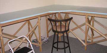 The benchwork consists of frames made from 1x4 lumber, with 2x2 legs attached and braced with 1x2 lumber. The table top is half-inch plywood.